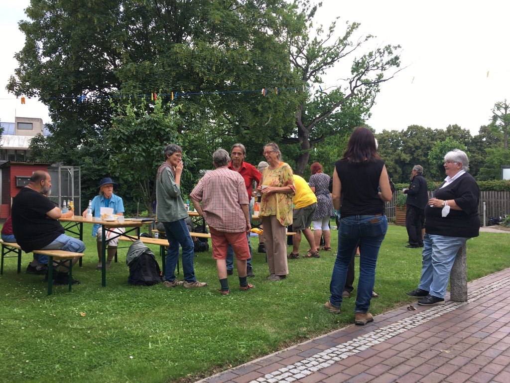 Das Anliegen der Gruppe war besonders. Eine Theologin aus Lützerath erklärte eindringlich, dass unter den noch existierenden Dörfern so viel Kohle lagert, dass, sollte sie noch bis 2038 gefördert und verstromt werden, so viel CO2 emittiert wird, dass Deutschland auf gar keinen Fall mehr sein Paris-Ziel erreichen können würde. Und: Das in Gorleben gesegnete Kreuz, das die Gruppe abwechselnd trägt, soll auf einer 40-qm-großen Fläche als Mahnung für die vielen Kirchen, die dem Kohleabbau weichen mussten, aufgestellt werden – eine Fläche, die RWE aus irgendwelchen glücklichen Umständen noch nicht erworben hat. Sie gehört dem Bistum Aachen, und Bischof Meister wurde gebeten, sein Amt zu nutzen, seinen kath. Amtsbruder zu bitten, das Stückchen auf gar keinen Fall zu veräußern und es nötigenfalls auf eine Enteignung ankommen zu lassen. Jede Zeitverzögerung könnte die Rettung bedeuten. Dies versprach der Bischof in sehr bewegenden Worten.
