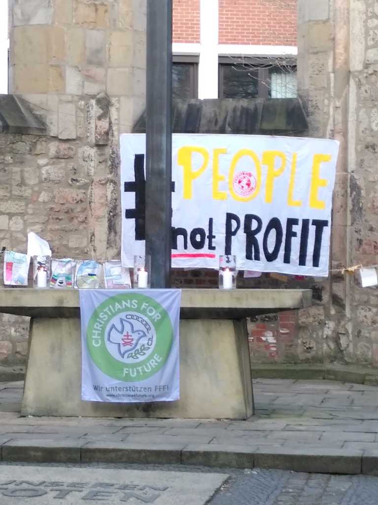 Inhaltlich hat uns in der Andacht das Motto des Streiks #PeopleNotProfit bewegt. Was macht die reine monetäre Profitorientierung einiger weniger mit uns und zuallererst mit den Menschen im Globalen Süden?