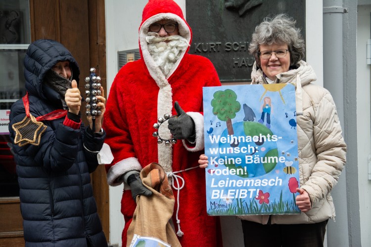 Und auch bei der Leinemasch machen wir weiter. Der Weihnachtsmann überbringt dem Büro Weil am 21.12.2023 einen großen Sack voller Postkarten von Bürgerinnen und Bürgern, die sich auch wünschen: Keine Bäume roden.