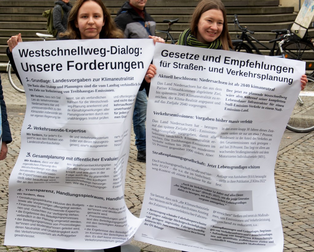 Wir stehen dort, weil nach dem Südschnellweg nun auch der Westschnellweg ausgebaut werden soll. Die Chance, es nun anders anzugehen, wird gerade wieder von den Verantwortlichen vertan. Der „Dialogprozess“ zum Westschnellweg ist ohne echte Beteiligung und Transparenz darüber, ob gesetzliche Klimavorgaben eingehalten werden, gibt es nicht.